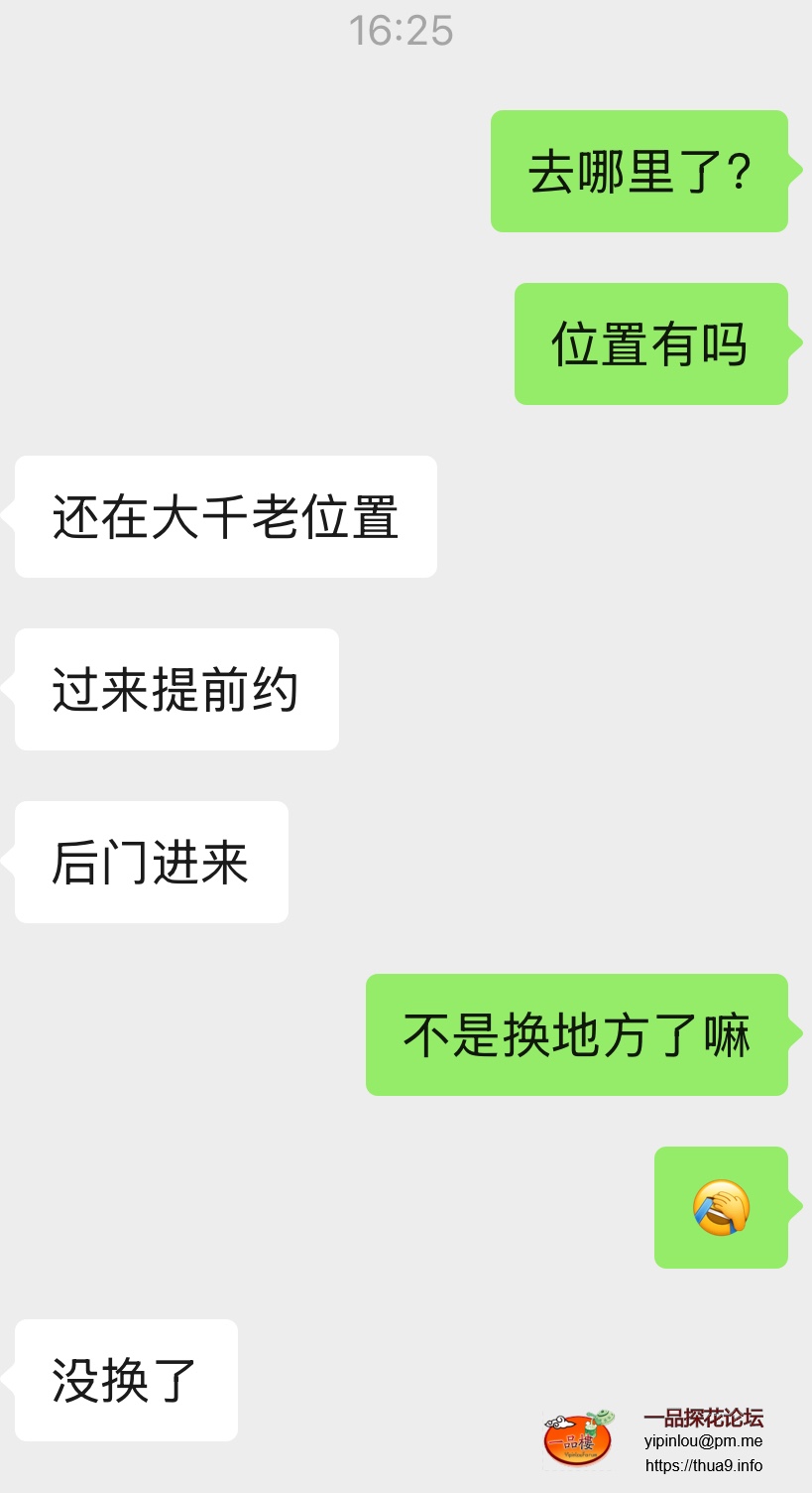 之前问了2个妹子,都没上班,都说25号以后上班,但是说换地方了,大千大检查被端了,说25号之后私信发位置,今天问了几个妹子……其中一个回复说不搬了,还在大千,老位置。其中一个说不敢去大千上班,准备回老......